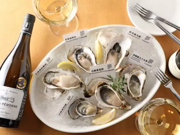 牡蠣と熟成肉の店【F.PARADE Life】。牡蠣は全国各地から旬のものを仕入れており、常時6種類以上用意されています。