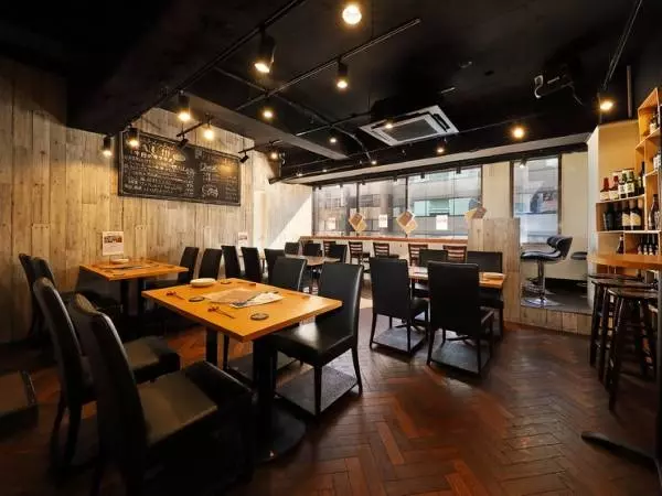 目黒駅から徒歩1分、レンガ造りのビル4階。扉を開ければ、木を基調にシックな色合いでまとめられた、落ち着いた空間が広がっています。大きな窓に面したカウンターは、一人で気軽に立ち寄りたいときにもぴったりの席。棚にはズラリとワインが並べられ、自分で手に取って選べるスタイルです。気軽に相談できるので、牡蠣料理とワインのお気に入りのマリアージュを見つけてください。