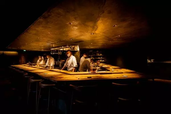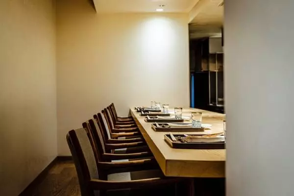 名店が立ち並ぶ銀座一丁目界隈に、2021年にオープンした日本料理屋【いづく】。入り口には床からすっと伸びた若木のような草書体の「いづく」の文字があり、それが看板代わりです。小さな木の扉を開ければ、そこは温かみのある落ちついた空間。【京都吉兆】で学び、弱冠23歳で店の料理長となった崎楓真さんが迎えてくれます。