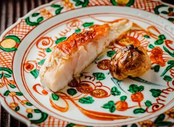 食事の前には、まず極上の八女茶を一献。それが非日常の世界に入るトリガー的役割となり、おまかせコースがスタートします。提供されるのは、薪をベースとして扱っている日本料理。その月その月で適性の高い食材を使い、素材の味を尊重した料理を提供しています。写真の金目鯛は、やさしい薪の熾火で火入れした後に皮目だけ香ばしく仕上げた逸品。