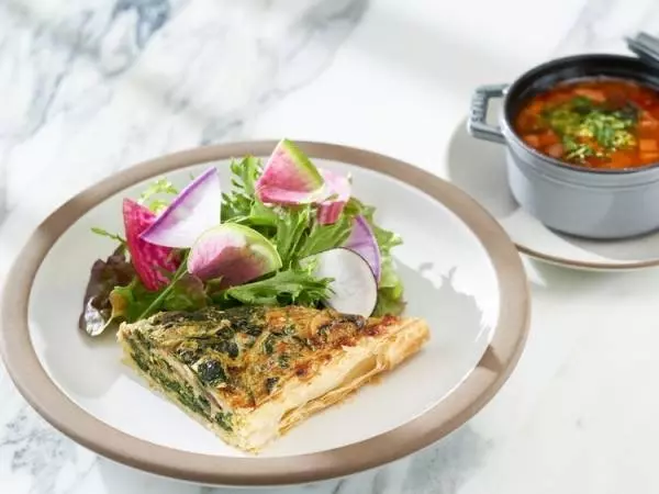 1,500 円/季節野菜をふんだんに使用した、具だくさんの自家製キッシュ。野菜たっぷりのミネストローネ付き