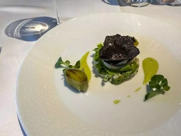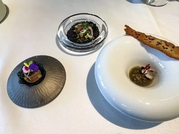 田中シェフは、フランスで日本人として史上最年少でミシュラン2つ星に輝いた人で、ランスでは基本その土地のもの、大量流通しない地元の小規模生産者の食材やお酒を使うことで高い評価を受けています。綺麗な一皿です。蟹の香りが立ち上がります。