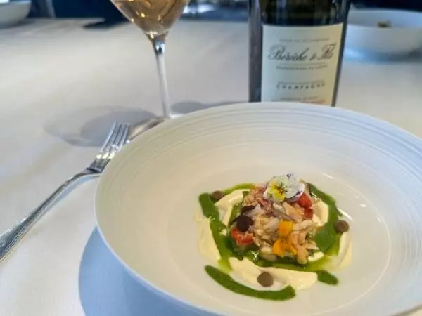 合わすのはロゼ・エクストラ・ブリュット・カンパニア・レメンシス2018。タラバガニの凝縮した旨さを若々しいロゼが引き立てます。