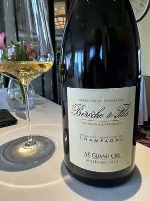 ヒラメの料理とウサギの料理が出るから、それに合わせてほしい、とエクストラ・ブリュット・アイ・グランクリュ2014が出されます。アイは村の名前で、ここのグランクリュを購入してつくった代表作のシャンパーニュです。ピノノワール80%、シャルドネ20%のパワフルなもの。「貝を煮詰めたブイヨンを感じる」とベレッシュさん。確かにマリンアロマのようなものを感じます。
