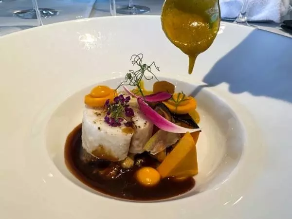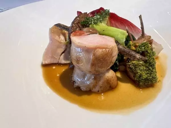 ヒラメの料理は田中シェフのもの。野菜の彩りが美しく、バターナッツのソースが薫り高く、どこかフランスの郊外の田園風景と重なってきます。田中シェフのレストラン【racine】では1回の食事で25皿ほどの料理を出し、月に一度そのメニューを変えるのだとか。またひと月のなかで日々変わっていくものも多いため、あえてスペシャリテのようなものは用意しないそうです。