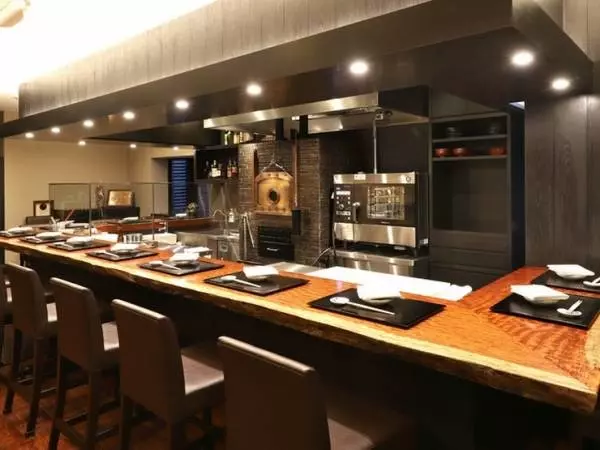 奥に炭火焼ステーキ用の炉窯が設置された個性的なカウンター