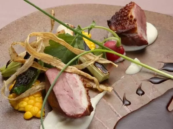 四季を映す地元の京野菜や日本海から直送の鮮度抜群の魚介類など、こだわり素材を厳選。4日間熟成したカモ肉を独自の香辛料でマリネした『宇治鴨のロースト』など、京都ならではの素材を活かしたメニューが自慢です。京の粋を盛り込んだ華やかな盛りつけにも心躍ります。