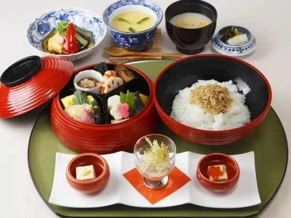 上段に取り肴、下段に生ゆばやご飯などを配した弁当仕立ての一品
