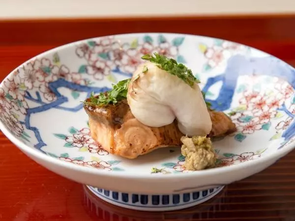 この時期ぜひ味わいたいのが、旬の走りとして市場に出回るサクラマスに名残として並ぶフグの白子を合わせた一皿、『サクラマスとフグの白子木の芽焼き』です。あっさりとした味わいのサクラマスに、白子のソースで濃厚さをプラス。爽やかな香りのフキ味噌も絶妙なアクセントを加え、春の訪れを感じる一品です。