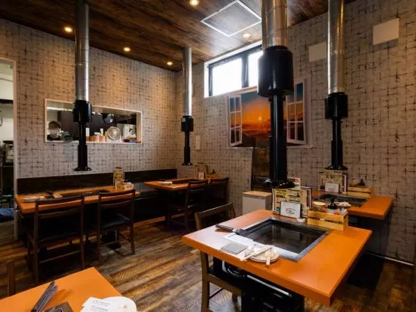 カジュアルな空間に、鉄板のあるテーブルが並ぶ