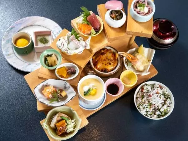季節の彩りと旬の味わいを“少しずつ、いろいろ”楽しみたい。そんな、ちょっぴり贅沢な願いが叶う本格会席のランチです。階段状に盛りつけるユニークな趣向も話題に。