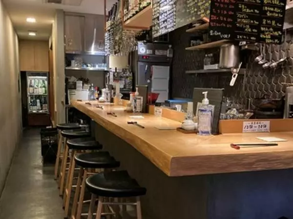 “新橋らしからぬ”と言われるオシャレな外観も話題。店内はカウンターメインのシンプルさですが、掘りごたつ式のテーブル席も用意しています。季節物、限定物、レア物を中心に1本ずつ仕入れるという日本酒は、月平均約40種が入れ替わるというから驚き。