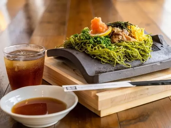 山口県を代表するソウルフードで、全国的にも知られている「瓦蕎麦」。熱々の瓦の上に茶蕎麦や錦糸卵、牛肉などをのせて提供する料理です。【西京酒場「萬天」】の『瓦蕎麦』は、外側の香ばしさと内側の面のもちっとした食感がやみつきになります。