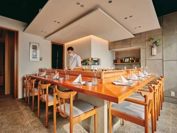 開放的なカウンター席は、従来の鮨店とは一線を画するカジュアルな雰囲気。背後には奥田シェフの地元、山形県・荘内浜を中心とした日本海側で獲れた魚介に合わせるオイルがズラリと並びます。もちろん個室もあり。選び抜かれた日本酒とワインを楽しみながら、極上のひとときを満喫してみて。