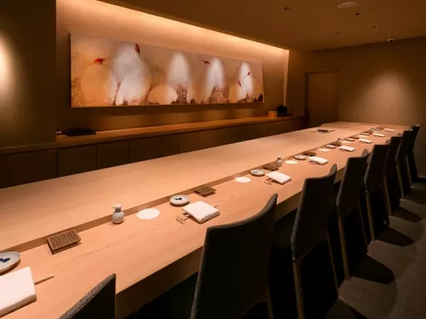 和の風情漂うアプローチの奥に現れるのは、白木の一直線のカウンター席。