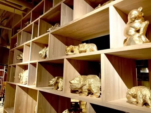まず7階のエントランスに入って驚くのが、【KIBORI】の店名の上に立つ大きな木彫りの熊、そしてゴールドに輝く大小無数の熊、熊、熊……。北海道レストランとしてオープンした同店は、メニュー内容だけではなく、その場に来た方たちが至る所で北海道を感じられるようにと造られたそうです。その最たるものが、北海道土産としてのイメージも強いこちらの木彫りの熊。お店をオープンするにあたり全国から木彫りの熊たちを集め、再び輝けるようにと一体一体ゴールドコーティング加工した上で店内に飾ることにしたのだそう。