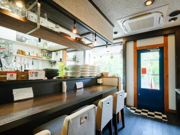 青い扉がアクセント、窓から見える緑にも心癒される店内