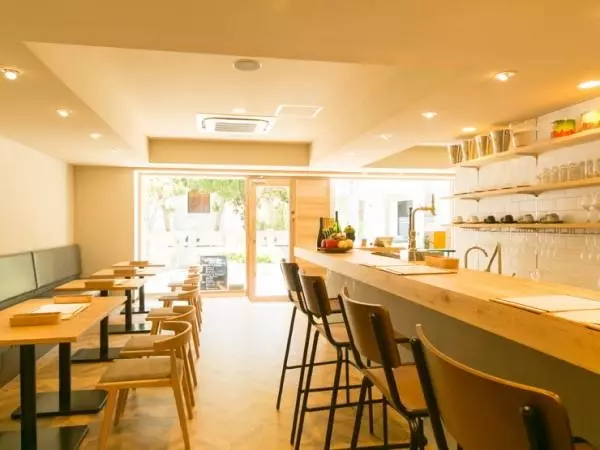 ガラス張りのオシャレな外観。扉を開けると、木目と白い壁を基調とした居心地良い空間が広がります。大きな窓から射し込む光で、いつも明るく開放的な雰囲気の店内。北野散策を楽しむデートにはもちろん、女性同士の集まりなどにもよく似合います。