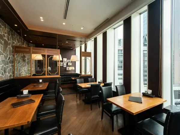 大きな窓から大阪駅前が一望できる店内は、黒をベースとしたシックな装い。ソファ席が心地いい半個室の用意もあり、最大6名までの利用が可能です。抜群のロケーションはデートスポットとしてもオススメ。見事な夜景を楽しむプランには、ハンバーグを盛り込んだコース料理が人気です。