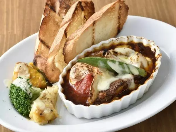 みなとみらい線・日本大通り駅から徒歩3分。【シチュー&カリー横濱KAN(横浜カン)日本大通り本店】の自慢は、厳選素材を20時間かけてじっくりと煮込み、旨みを凝縮したシチューとカリー。『季節野菜のシチューグラタン』は、ビーフシチューの深いコクと季節野菜の相性が抜群です。