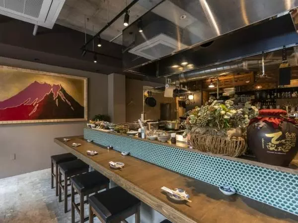 入口を入ってすぐに広がるのが、オープンキッチンのカウンター席。温かさが満ちる、落ち着いた雰囲気の掘りごたつ式のテーブル席は、つなげれば最大20名のキャパシティを誇ります。さらに、円卓を囲むシックな少人数用の個室もあり。どの座席もつい長居したくなる居心地のよさです。