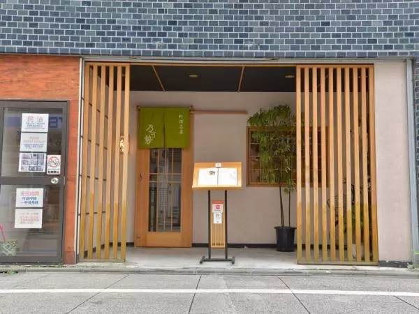木の格子のファサードが目を引く【料理茶屋乃可勢】。ホテルの和食レストランや割烹料理店などで経験を重ねた店主・奥富さんが、茶室のような空間でゆったり過ごしながら、おいしい料理を楽しんでほしいとの思いから、2017年にオープンしました。