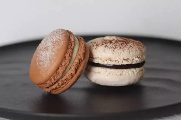 フィナンシェだけではなく、マカロンも用意。白いマカロンは、生地にチーズ、クリームにコーヒーをふんだんに入れ、コーヒーを強く感じるティラミス風味のマカロン。黒いマカロンは、生地にコーヒー、クリームにチーズを入れており、よりティラミスを感じられるマカロンです。