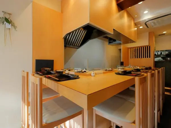 コの字型のカウンター8席だけの店内は、木の風合いに包まれる温かで落ち着いた雰囲気。隠れ家のような特別感も自慢です。目の前の調理で揚げたてが供されるライブ感が楽しめますが、IHフライヤーだから熱や油のにおいなどの心配も無用。あまり気にすることなく、快適なひとときが過ごせます。
