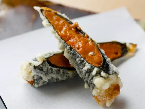 うにの旨みを、磯の風味豊かな海苔の中に閉じ込めた贅沢な逸品。薄口ごま油とコーン油を独自にブレンドした揚げ油でサクッと仕上げています。素材本来の持ち味を引き立てる、ほのかなごまの香りが絶妙。