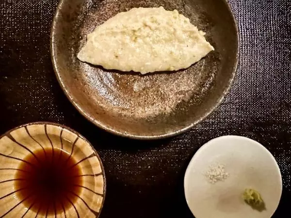 まずは蕎麦がきが出てきます。粗挽きの蕎麦がきは埼玉県三芳町の在来種。香りを楽しんだあと、塩と山葵を少しつけていただきます。