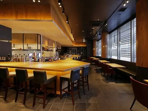 新橋駅から徒歩6分のところに、2022年にオープンしたビストロが【Charcoal Grill & Global Beer Asahi The Grill】。木材をメインにつくられた店内は、柔らかみのある雰囲気。天井が高くなった開放感あふれる空間が、くつろぎのひとときを演出します。躍動感のあるライブキッチンが楽しめるオープンキッチンも自慢です。
