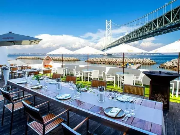 明石海峡大橋をパノラマで見渡しながら食事を楽しめる絶景レストラン【BUCHI】。昼間はスカイブルーからサンセットオレンジに変わり行く海岸線を、夜はライトアップされた明石海峡と夜景の幻想的な風景を眺めながら、大人がしっとりと料理やお酒を味わえる“非日常”の空間として人気です。また潮風が気持ちいいテラスでは、BBQを楽しむこともできます。