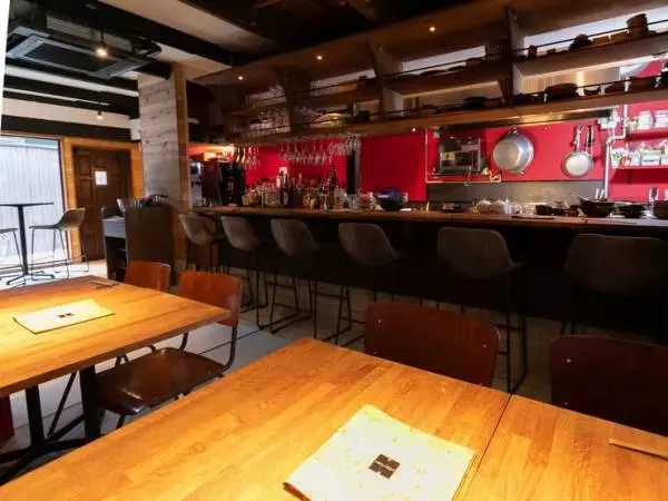 シックな店内は、オープンキッチンのカウンター席をメインに、グループでもゆったり過ごせるテーブル席を用意。風情ある通りが眺められる窓際にも、ふたりで語らえるバーテーブルの座席を配置しています。四条通りに近いので、グラスを交わす間にも祭りもお囃子が聞こえてくるかも。