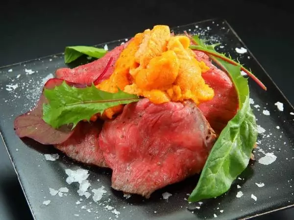とろける味わいがたまらない、『黒毛和牛極上ローストビーフ生うにのせ』
