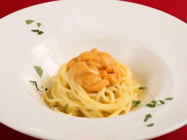 自家製平打ちパスタ「タリオリーニ」とウニソースが絡んだ『北海道産 生ウニのペペロンチーノ 自家製タリオリーニ』