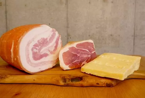 左からパンチェッタ アッニカータ、イタリアから仕入れるパルマの生ハム、パルミジャーノ レッジャーノ。パンチェッタは自家製、無添加
