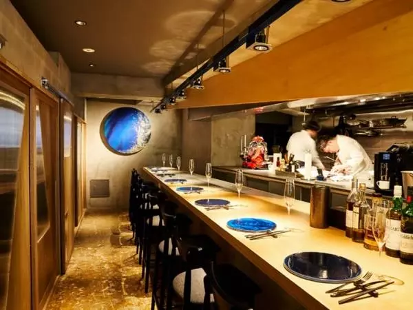 端正でシンプルな店内の主役は、オープンキッチンのカウンター席。シェフらの技を目の当たりにしながら、「瞬間の香りや温度感」を大切にした料理との出合いが堪能できます。郷土の淡路島の土を使い、地元の瓦メーカーに発注したというこだわりのショープレートにも注目です。
