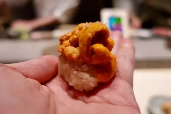 北海道を代表するウニ卸、小川商店の生バフンウニを贅沢に握りで。大将から手渡される握りは繊細なバランス、一口で頬張りたい。