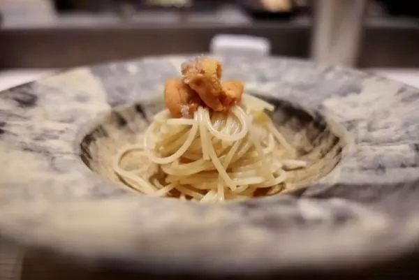 雲丹ラバー歓喜の『無何ウニ』コースの全貌、気になりますよね?期間限定だからこそ実現した採算度外視、唯一ウニにまみれるの悶絶コースの全貌をご紹介します。まずは、挨拶代わりの一品目『和のだしで茹でた雲丹パスタ』。冷製のカッペリーニ仕立てのこちらは素麺のような喉ごしに濃厚な「バフンウニ」をたっぷりとライドオン。