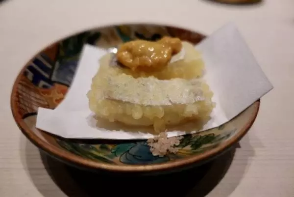 「太刀魚の天ぷらをどうぞ、違いを楽しんでください」と言って供された逸品がこのビジュアル。片方に何かのってます(笑)