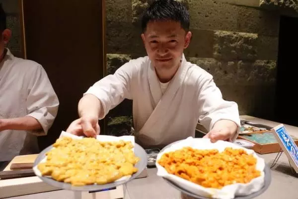 そろそろ後半戦と思った矢先に、何やら大量のウニをのせて不敵な笑みを浮かべた職人さんが、ドヤ顔で迫ってきます。これ、この後使うんですよね。。。