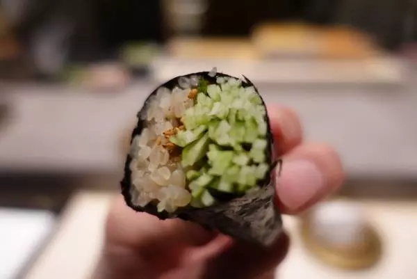 梅の代わりに鮪の血合い節の酸味を効かせたかっぱ巻。キュウリの芯の甘い部分だけを使用した逸品