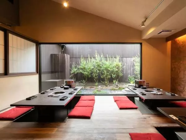 京阪本線 藤森駅から徒歩6分、長く続く石畳の先にある【焼肉どころ鼎】。京都で指折りの精肉卸売業者がプロデュースする、高品質・低価格の本格焼肉店です。店内は、京都の風情を醸し出す和モダンな空間。掘りごたつ式のカウンターでは、鉄板焼きの醍醐味を目の前で楽しめます。落ち着いた半個室や、庭が見渡せる広々としたテーブル席も。旅の思い出とともに、おいしい焼肉を心ゆくまで味わってください。