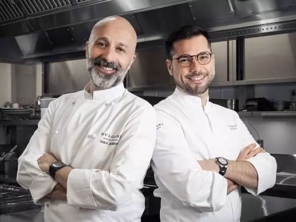 全世界の【イル・リストランテ ニコ・ロミート】を監修するシェフ、ニコ・ロミート氏(左)。東京のシェフを務める、マウロ・アロイシオ氏