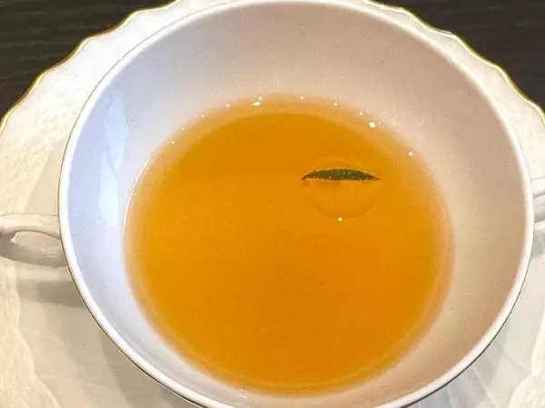 例えば、最初に運ばれてくる、白いジノリのカップに入れられた琥珀色のスープ。凝縮した野菜のエキスを感じるスペシャリテです。ひと口含めば、ふわっと広がる野菜のエネルギッシュな濃い香りと味わいにびっくり。聞けば、水は一切加えずに、玉ねぎ、人参、セロリの水分だけで煮詰めて、ほんの少しのフランチャコルタと塩とオリーブオイルで味を整えたものだそう。シンプルだけれど奥が深い。この後に続く料理への期待が高まります。
