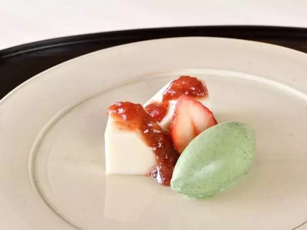 締めくくりの楽しみは、独創性に富む和のデザート。写真は春の一例、『よもぎアイスとごまの白あん寄せといちご』。よもぎの香り、ごま風味の白あんの甘み、いちごの酸味が折り重なり、春の訪れを告げます。