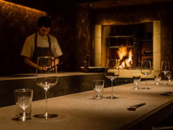 静謐な空間でゆらめく炎が美しい店内。薪による火入れの技術と発酵を組み合わせた、新しい日本料理を作りだしています