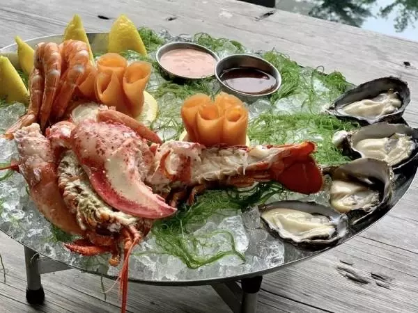 大変豪華な『プレミアムシーフードプラッター』は、カナダ産オマール海老、自家製スモークサーモン、カウアイ海老、国産オイスターを贅沢にのせたプラッター。オリジナルオーロラソースと、牡蠣にはエシャロットを加えたレッドワインビネガーが添えられています。なんと贅沢なのでしょう……!