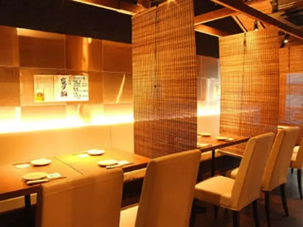 店長選りすぐりの焼酎や地酒がズラリと並ぶカウンター席、簾で仕切れば個室感覚で利用できるテーブル席、10名まで収容可能な座敷個室など、2階建ての店内にさまざまな座席を用意。