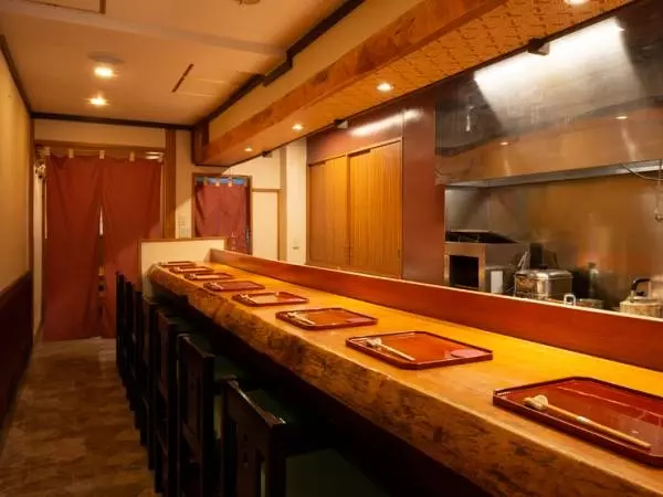 店内に入ると、まず目を引くのが約5mもある、桂の木が使われた一枚板のカウンター席。ゆったりと席間が取られていて、くつろいだ時間を過ごすことができるほか、店主とのトークを楽しむことも可能。記念日や会食を水入らずで楽しみたいというときには、個室も用意されています。